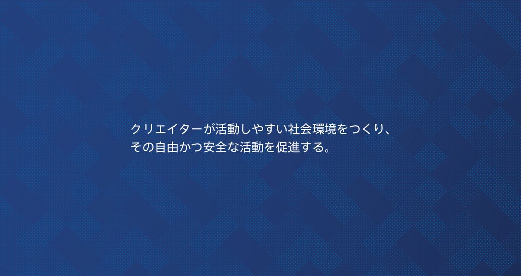 本協会は、「クリエイターが活動しやすい社会環境をつくり、その自由かつ安全な活動を促進する」をミッションに、クリエイターエコノミーの普及・促進とその活性化に向けた様々なアクションを実施していきます。
